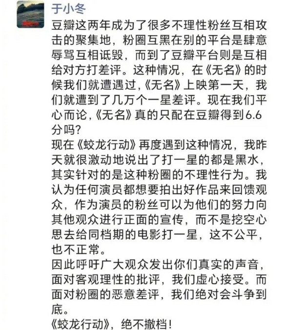 博纳影业董事长于冬在春节档期间多次对外发声,称给《蛟龙行动》打一星的都是“黑水”,并还表示《蛟龙行动》绝不撤档。值得一提的是,《蛟龙行动》原本计划与《哪吒之魔童闹海》、《唐探1900》等电影在大年初一一同上映,但《蛟龙行动》却选择提前“抢跑”,于1月26日与27日进行超前点映。